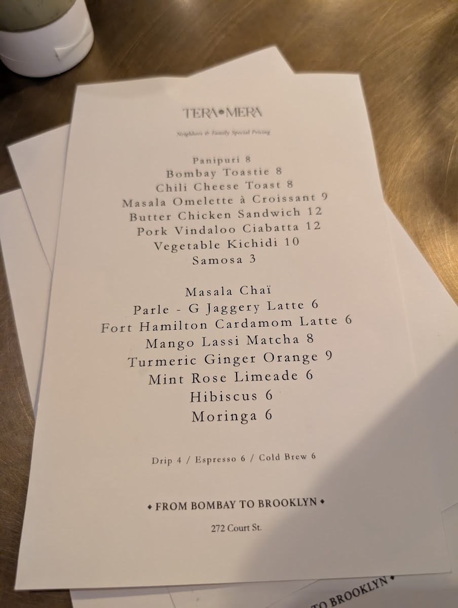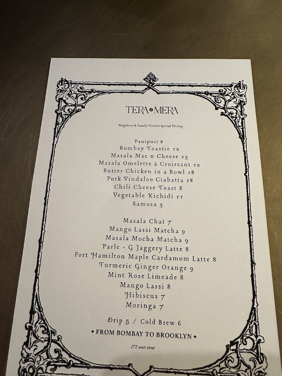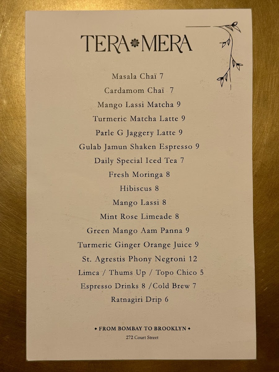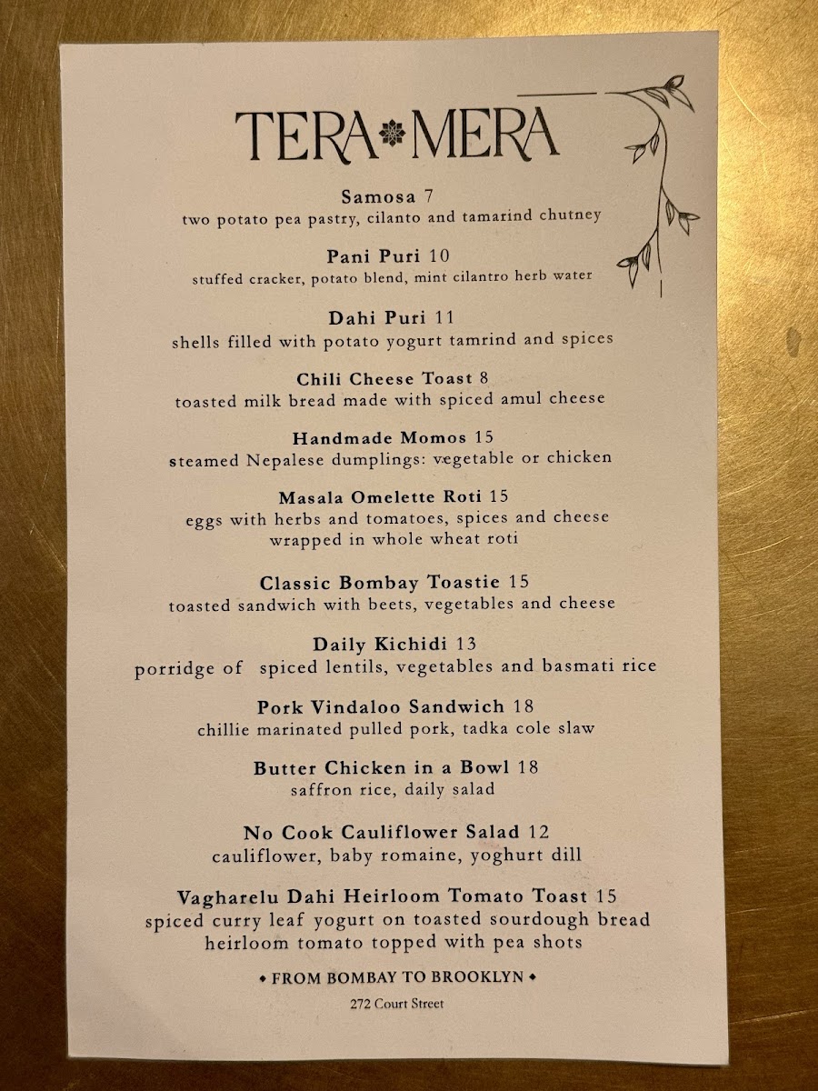 From a reviewer’s perspective, the menu at Tera Mera, located at 272 Court St in Brooklyn, feels like a thoughtfully curated snapshot of comforting Indian flavors rather than an overwhelming list of dishes. What stands out most is how each category complements the others, creating a well-rounded dining experience. The house-made Achar - Pickles, featuring raw turmeric and green chili, immediately set the tone with bold, tangy notes that wake up the palate, while the classic Chutneys-Cilantro Mint and Tamarind-add freshness and balance to every bite. The bread selection keeps things simple yet satisfying with Naan and Chappati, perfect for pairing with any savory item on the table. On the sides, the playful Mini Air Fried Samosas for 6 offer a lighter, crispy snack option, and the Masala Mac and Cheese delivers a comforting fusion twist that feels both familiar and inventive. To round everything off, the drink choices of Limca and Thums Up provide a nostalgic, fizzy finish that pairs well with the spices throughout the menu. Overall, Tera Mera’s menu may be concise, but it is intentional and cohesive, leaving a lasting impression through quality, balance, and a clear sense of identity.