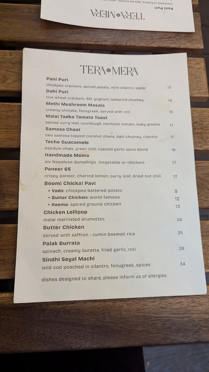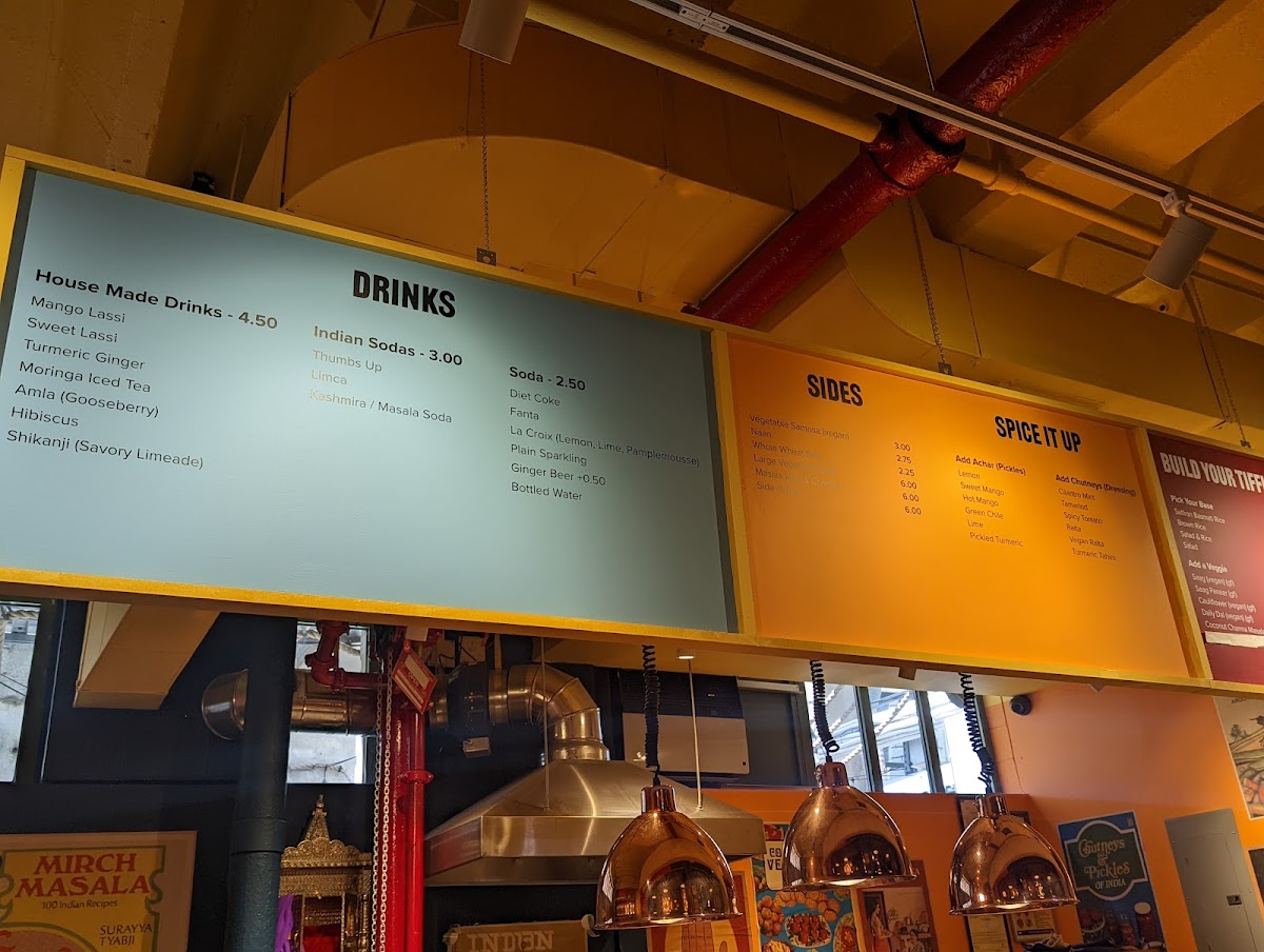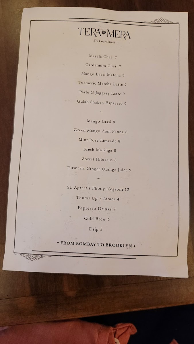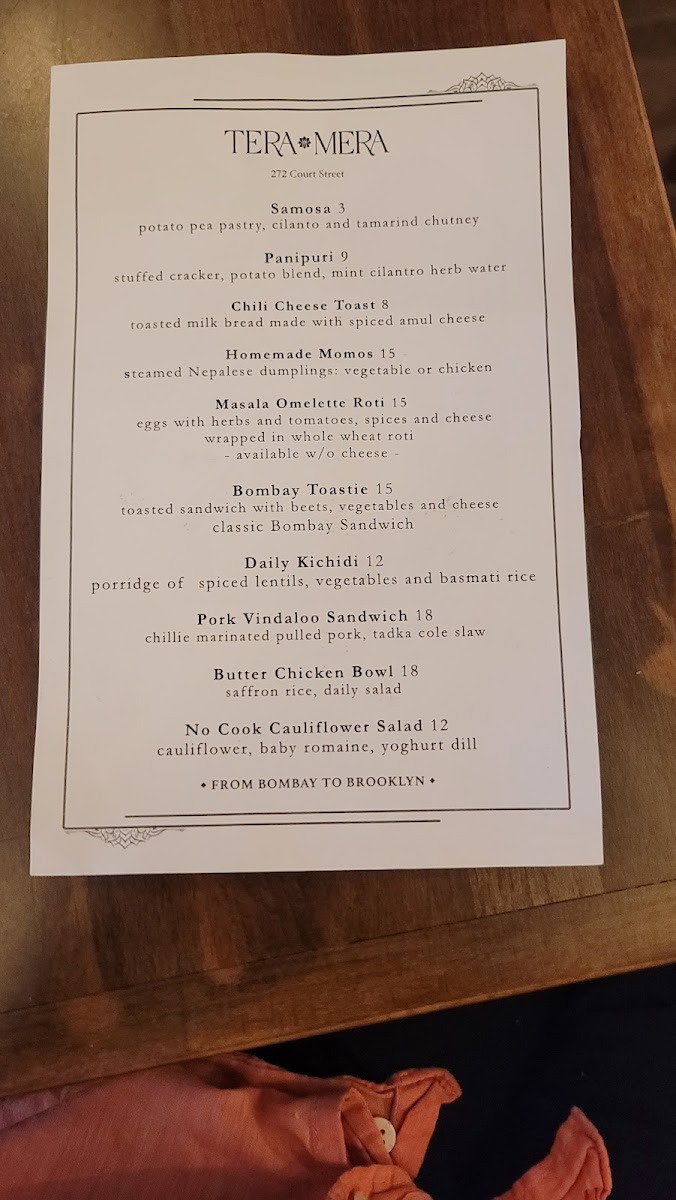 From a reviewer’s perspective, the menu at Tera Mera, located at 272 Court St in Brooklyn, feels like a thoughtfully curated snapshot of comforting Indian flavors rather than an overwhelming list of dishes. What stands out most is how each category complements the others, creating a well-rounded dining experience. The house-made Achar - Pickles, featuring raw turmeric and green chili, immediately set the tone with bold, tangy notes that wake up the palate, while the classic Chutneys-Cilantro Mint and Tamarind-add freshness and balance to every bite. The bread selection keeps things simple yet satisfying with Naan and Chappati, perfect for pairing with any savory item on the table. On the sides, the playful Mini Air Fried Samosas for 6 offer a lighter, crispy snack option, and the Masala Mac and Cheese delivers a comforting fusion twist that feels both familiar and inventive. To round everything off, the drink choices of Limca and Thums Up provide a nostalgic, fizzy finish that pairs well with the spices throughout the menu. Overall, Tera Mera’s menu may be concise, but it is intentional and cohesive, leaving a lasting impression through quality, balance, and a clear sense of identity.